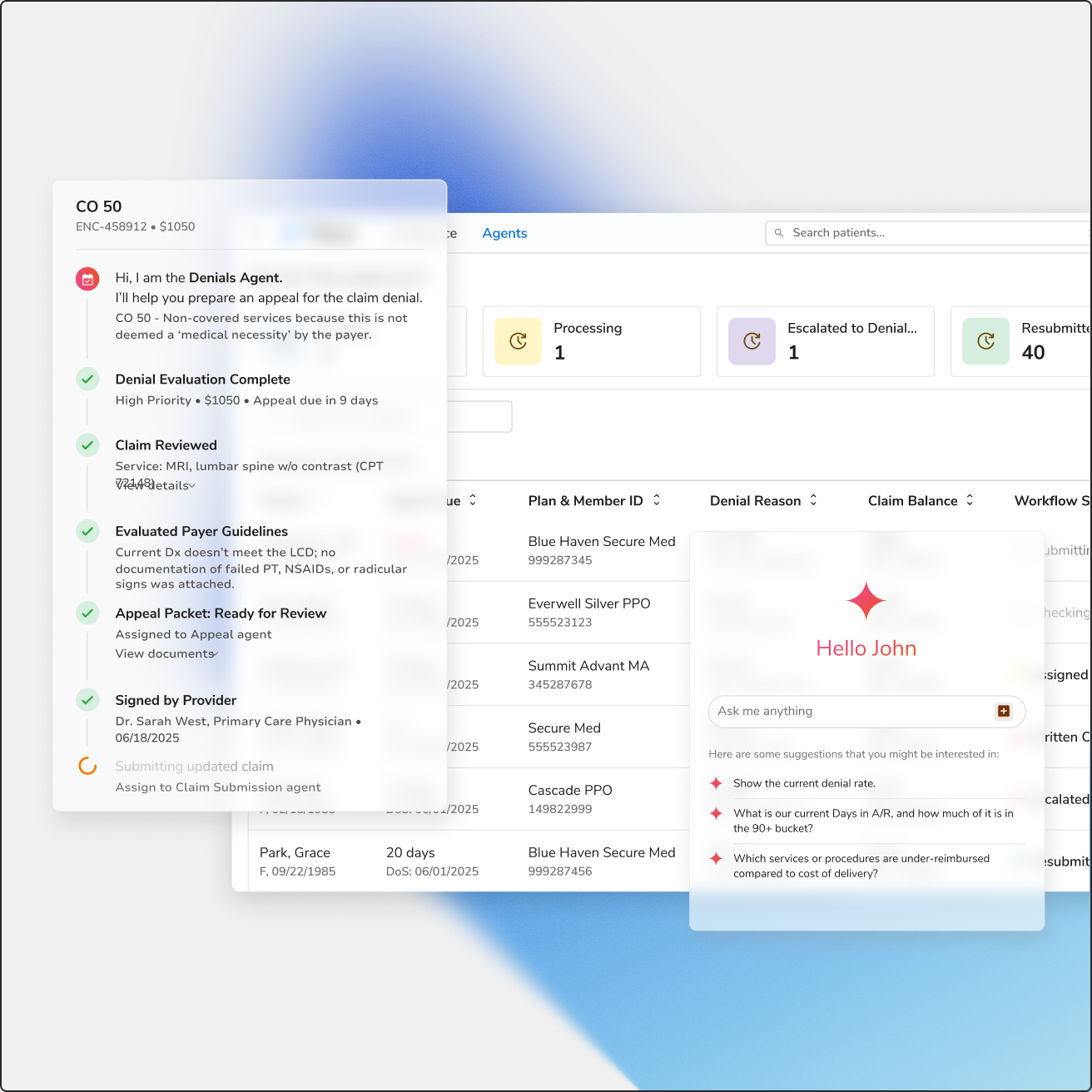 Denial Management Agent classifies denials immediately, offers root-cause analysis, and sends them to the designated SPOC for quick resolution. This early action boosts appeal success rates and keeps claims from aging into write-offs.