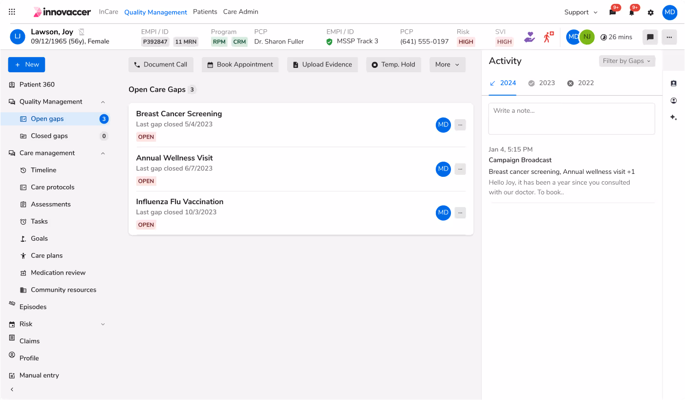 Intelligent algorithms enrich the data the previous stage with deep insights. Out of the box, this includes each patient’s disposition toward quality measures (numerator, denominator, exclusions), risk and social vulnerability profiles, gaps in care, engagement data, next best actions, and more.