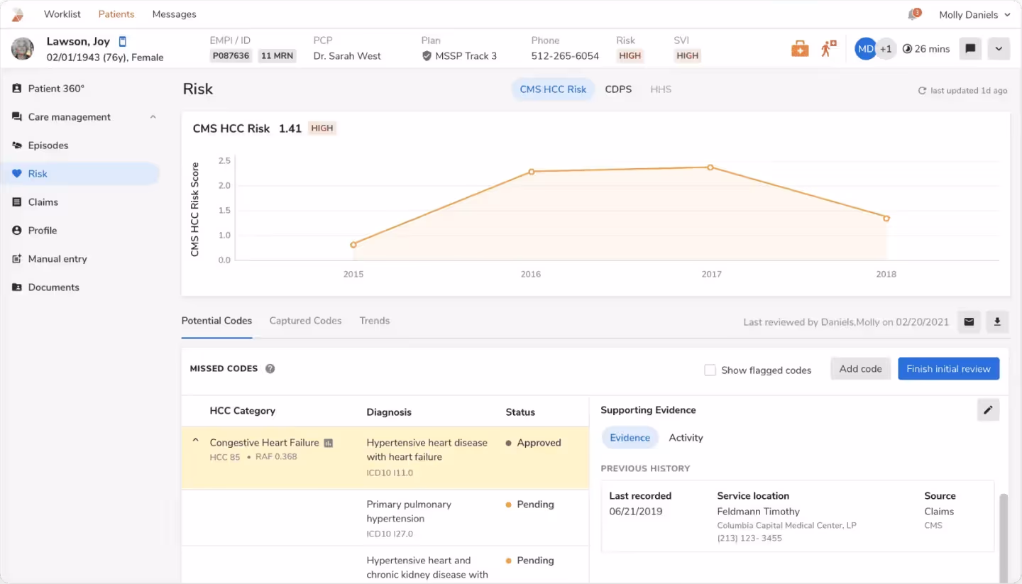 Intelligent algorithms enrich the data the previous stage with deep insights. Out of the box, this includes each patient’s disposition toward quality measures (numerator, denominator, exclusions), risk and social vulnerability profiles, gaps in care, engagement data, next best actions, and more.